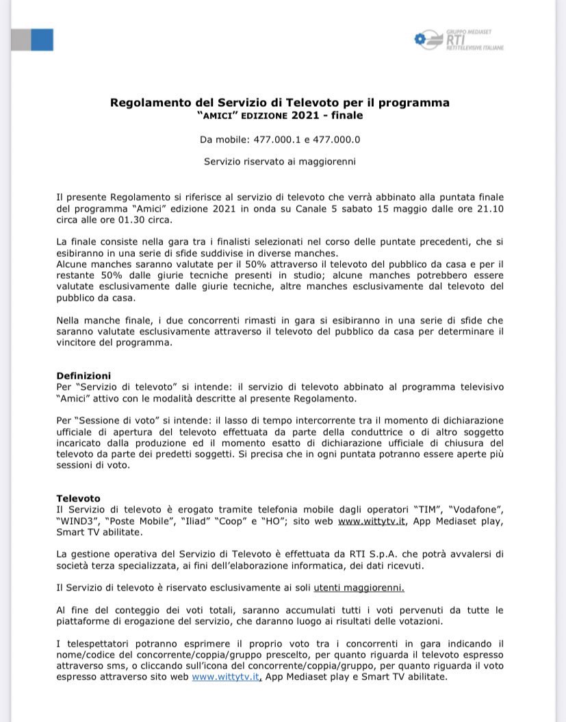 Il suddetto regolamento mette nero su bianco, però, che la sfida finale fra i due concorrenti rimasti in gara dovrà essere giudicata unicamente dal televoto del pubblico da casa che sarà unico giudice: