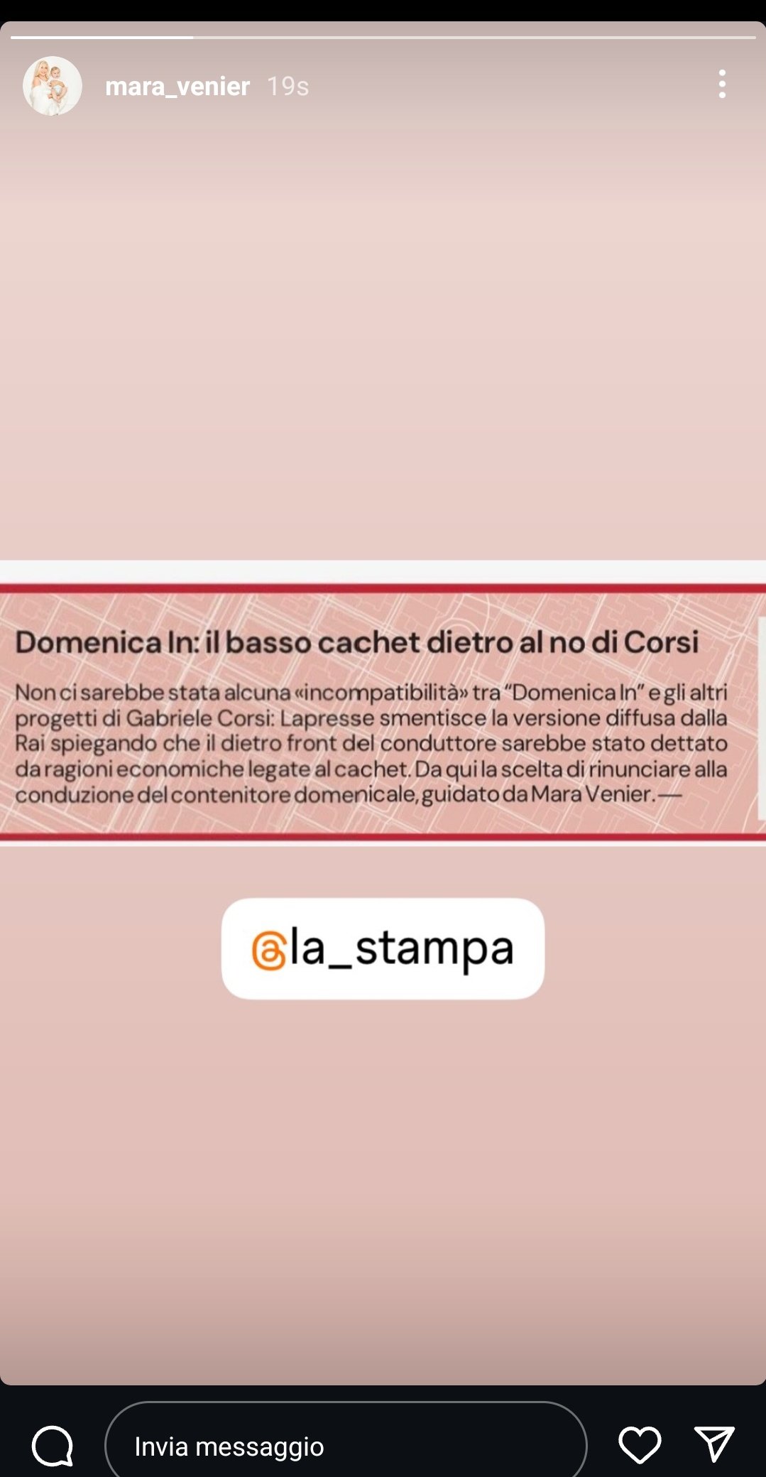 Il 24 luglio 2025, attraverso il suo profilo Instagram, Mara Venier aveva deciso di condividere sul suo profilo Instagram una pesante accusa che avrebbe giustificato l’uscita di scena di Gabriele Corsi dal suo programma: il conduttore avrebbe chiesto un cachet troppo alto. Per farlo si è avvalso di fotografare, ritagliare e pubblicare nelle sue storie un trafiletto apparso sul quotidiano La Stampa, che Venier aveva persino taggato quasi a mò di ringraziamento. [Fonte] Se già di per sé l’accusa è poco credibile – Rai annuncia un conduttore in conferenza stampa senza pattuirne prima il compenso? – a seguito di questo attacco il management di Gabriele Corsi fu costretto ad una solenne smentita.