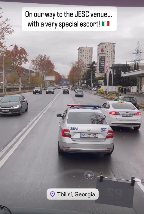 A confermare che i concorrenti dello Junior Eurovision 2025 siano sorvegliati speciali ce lo conferma un post social pubblicato online da un membro – adulto – delle varie delegazioni giunte sul posto. Nell’immagine che vi proponiamo in alto, è ritratta una foto scattata su un autobus che sta trasportando le delegazioni dall’hotel in cui soggiornano alla sede della gara televisiva (la Gymnastic Hall of Olympic City di Tbilisi). L’adulto che accompagna i baby concorrenti scrive: “Stiamo andando verso la sede del Junior Eurovision e… con una scorta molto speciale!”. Nella foto è ritratta una volante di un organo di polizia locale che scorta il fronte dell’autobus. È la prima volta in assoluto che assistiamo ad una testimonianza di questo tipo. E a confermare indirettamente che si tratti di qualcosa di insolito è proprio chi scrive quel messaggio visto che parla di una scorta “speciale”.