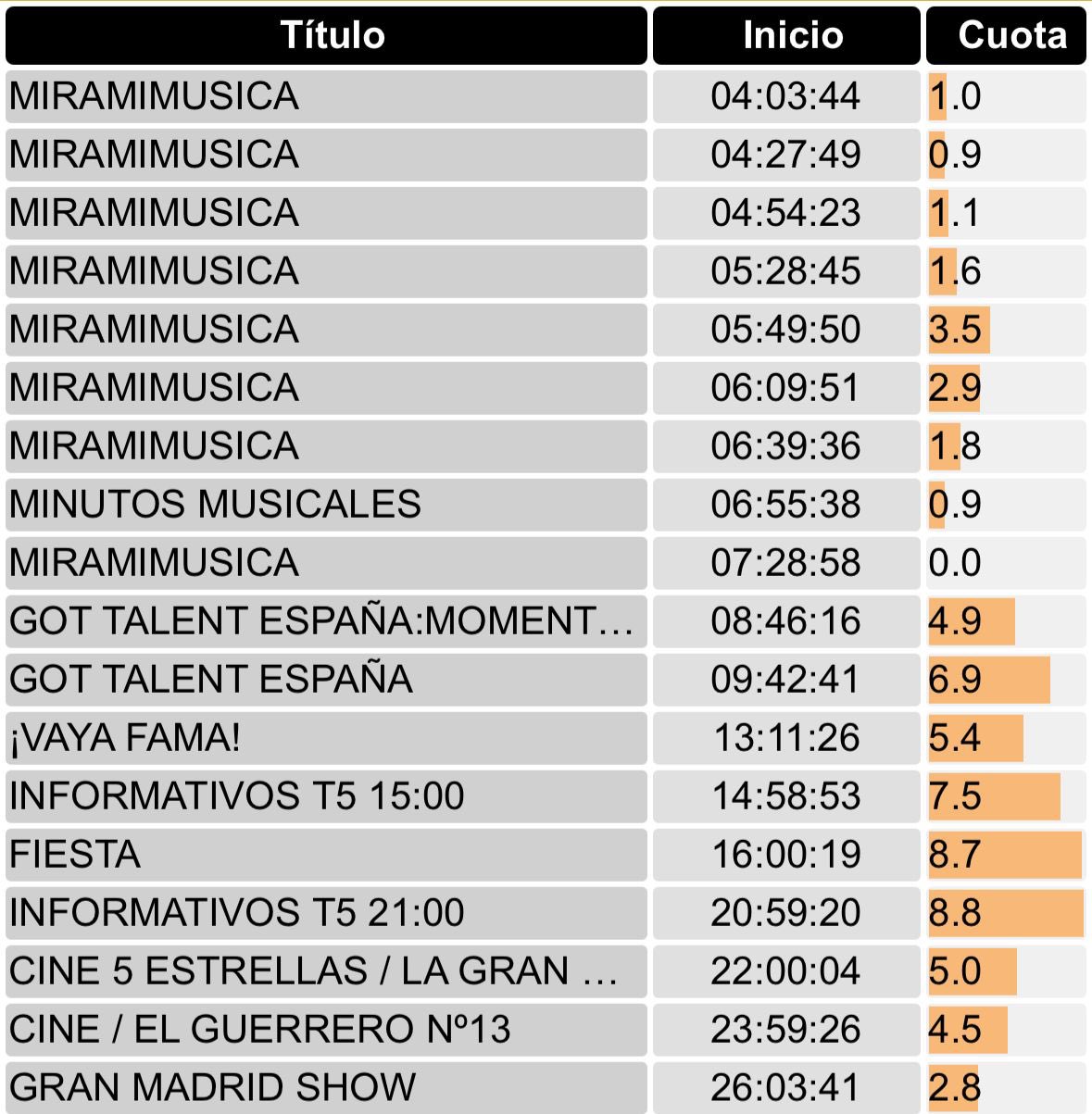 Come raccontano i portali d’informazione della Spagna – fra cui El Televisero di Huffington Post – tutta la giornata del 28 dicembre 2025 è stato un incubo per i signori di Mediaset: per tutta la giornata TeleCinco non ha mai superato il 9% di share, partendo da un cocente 0% di share nella fascia del mattino 07:30 – 08:45, per poi passare alle repliche di Got Talent che ha visto una salita fra il 5% e il 7%. Incredibile “cabronata” per lo show d’infotainement Vaya Fama al 5.4%. Il triste palinsesto si chiude con un primetime al collasso: un bel film valso un altro 5% di share. Oramai perennemente schiacciato dal canale pubblico La1 e dall’emittente commerciale Antena3, oggi TeleCinco di Mediaset è la reietta dell’offerta generalista in Spagna: la media mensile in share è di appena l’8.4%, uno dei peggiori dati di sempre da quando il canale è andato in onda.