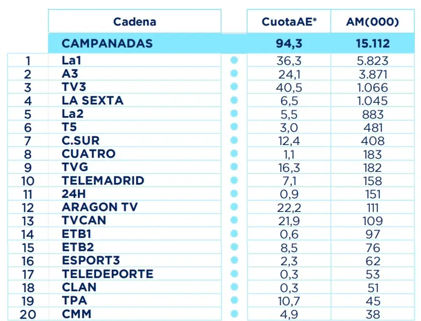 Se già il 28 dicembre 2025 la situazione era stata un disastro, non si può dire di aver fatto bene nemmeno la sera del 31 dicembre 2025 con gli eventi creati ad hoc per le “Campanadas”, i rintocchi che segnalano l’arrivo del nuovo anno. L’evento musicale presieduto dalla conduttrice Sandra Barneda e dal creator social Xuso Jones ha portato TeleCinco ad essere il sesto canale più visto della serata, dietro LA1, Antena3, TV3, La Sexta e La2. A seguire la festa Mediaset solo il 3% della share pari a 481mila spettatori. A confermarlo è una analisi del quotidiano locale Marca.