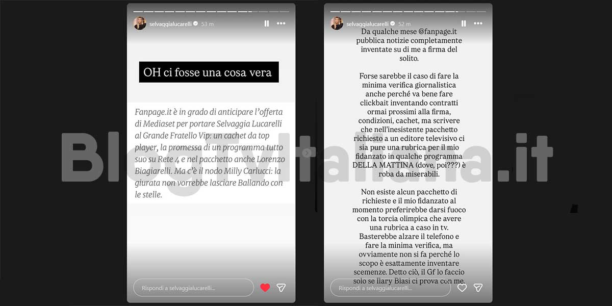 “Fanpage.it è in grado di anticipare l’offerta di Mediaset per portare Selvaggia Lucarelli al Grande Fratello VIP: un cachet da 35mila Euro a puntata, la promessa di un suo programma su Rete4 e nel pacchetto anche il fidanzato Lorenzo Biagiarelli” questo raccontava un articolo apparso sul noto portale partenopeo, commentato da Selvaggia Lucarelli con una sua solenne smentita. “Oh, ci fosse UNA cosa vera! Da qualche mese il sito Fanpage pubblica notizie completamente inventate su di me a firma del solito (Gennaro Marco Duello, ndr.) Forse sarebbe il caso di dare una minima verifica giornalistica anche perché, passi fare clickbait inventando contratti prossimi alla firma o cachet, ma scrivere addirittura che nell’inesistente pacchetto richiesto ci sia pure una rubrica per il mio fidanzato in qualche programma della mattina (quale poi?) è roba da miserabili. Non esiste alcun pacchetto […] Basterebbe alzare il telefono e fare una minima verifica ma non lo si fa perché lo scopo è inventare scemenze“.